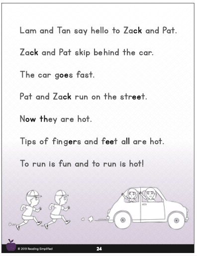 When a child encounters the text below from the Reading Simplified Academy, the teachers' purpose is likely to reinforce blending 3 sound words and reading words with the short "a" and "i" patterns. However, when the child gets to the words, "street," "fingers," and "feet" he has not yet been explicitly taught the "ee" sound or the "er" sound.