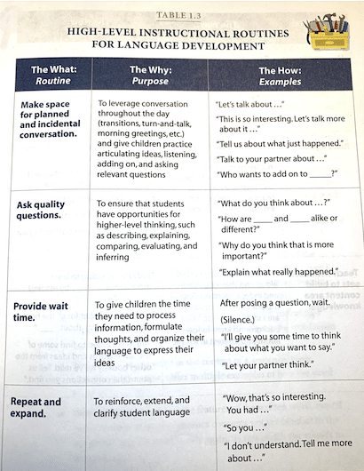 Once these misunderstandings are cleared up, the authors give us just a few high-leverage activities to adopt (see images below), such as ask quality questions, repeat and expand student language, and teach with text sets to build knowledge. These activities are doable and framed by both the logic of research findings and former routines in the balanced literacy classroom.