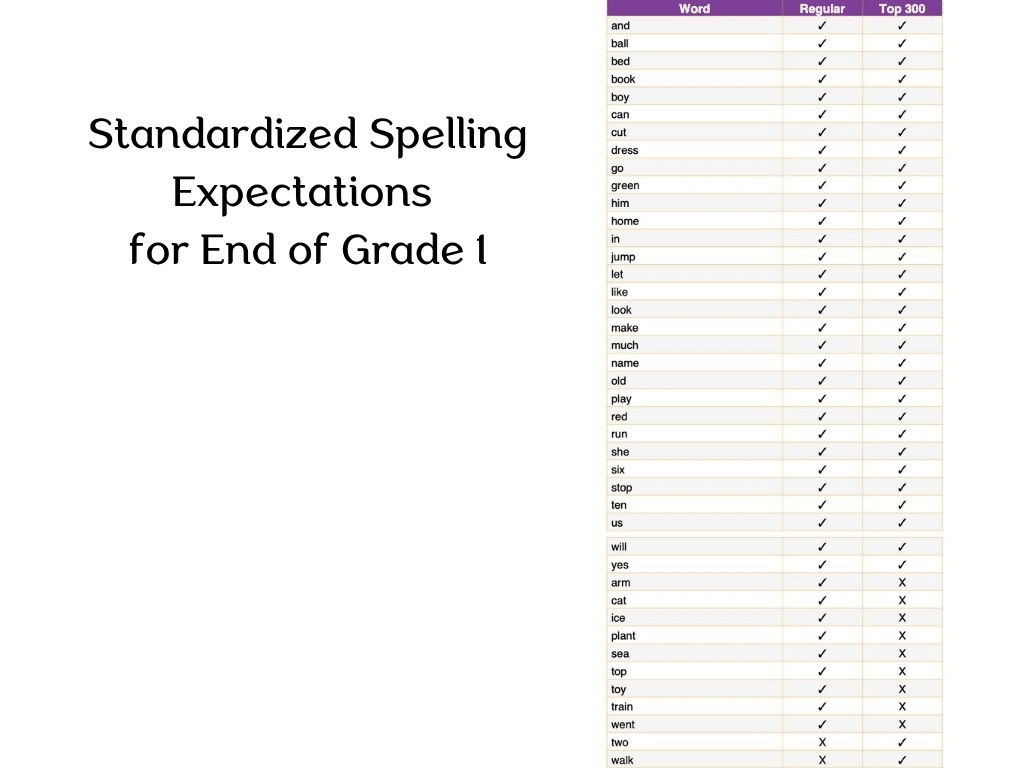 While we may teach many advanced phonics patterns and less frequent spellings for first grade reading instruction, national standards do NOT expect that all of that information will be transferred to spelling.